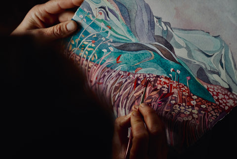 Painting tiny flowers and stems. Layering them over and under. Darkening places where it’s shadowy and leaving gaps where the light shines through. Imagining the way they might move in the wind. Bending and swaying. Mt Baker steady in the background.